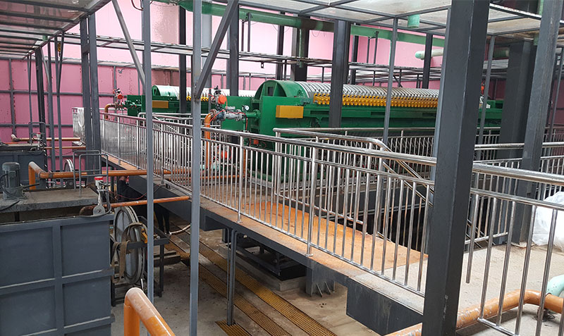 (2)重力濃縮脫水段:絮凝后的污泥經(jīng)布料斗均勻送入網(wǎng)帶,污泥隨濾帶向前運(yùn)行,游離態(tài)水在自重作用下通過(guò)濾帶流入接水槽。